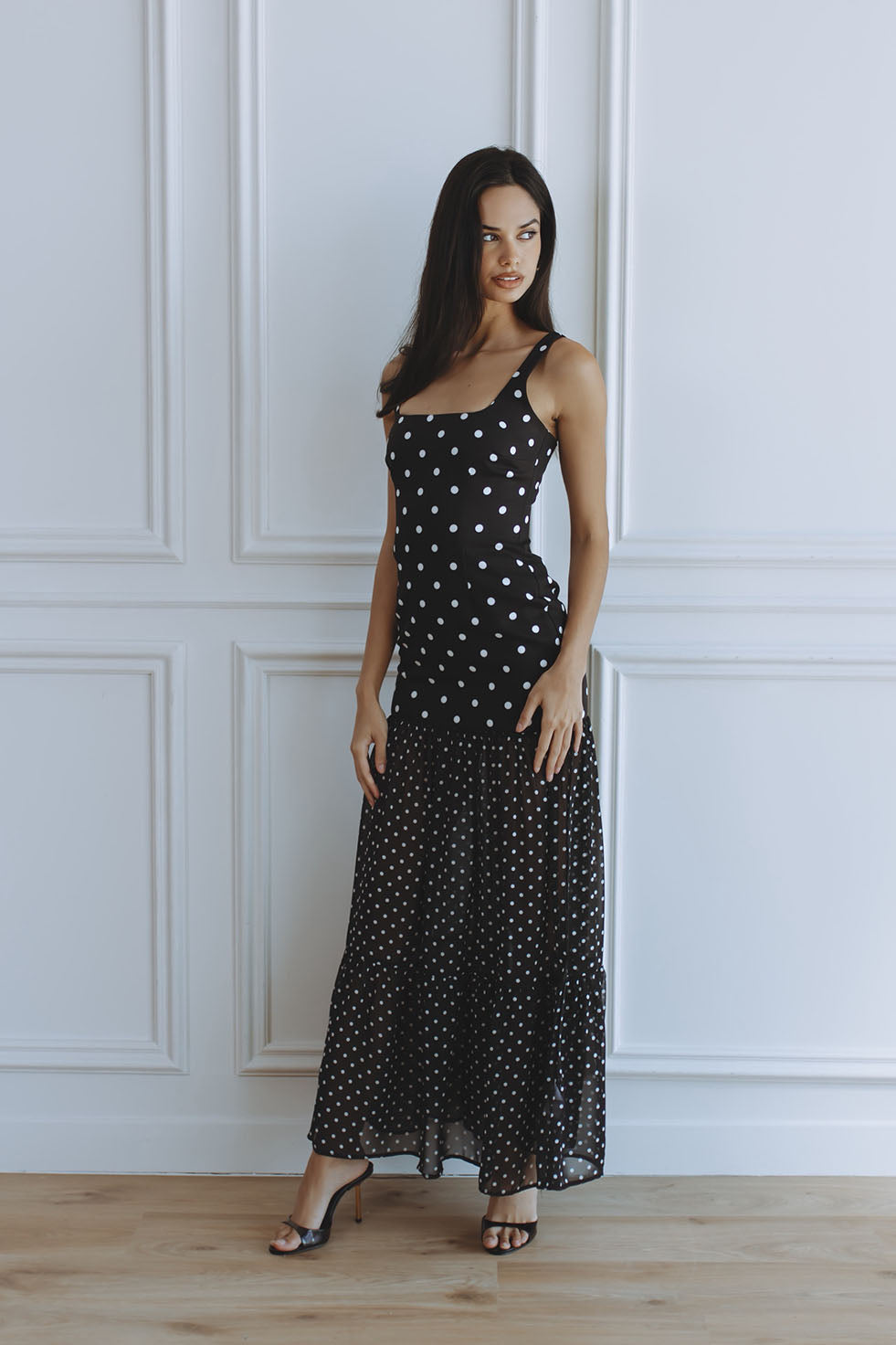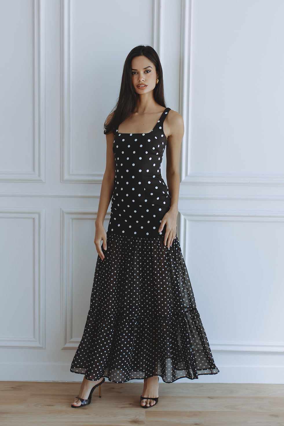 TILLIE SHEER BOTTOM MAXI DRESS - BLACK/WHITE POLKA