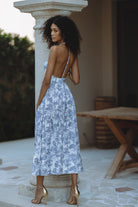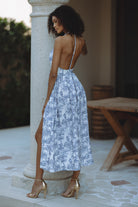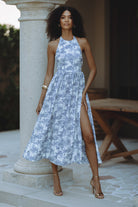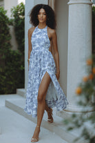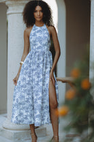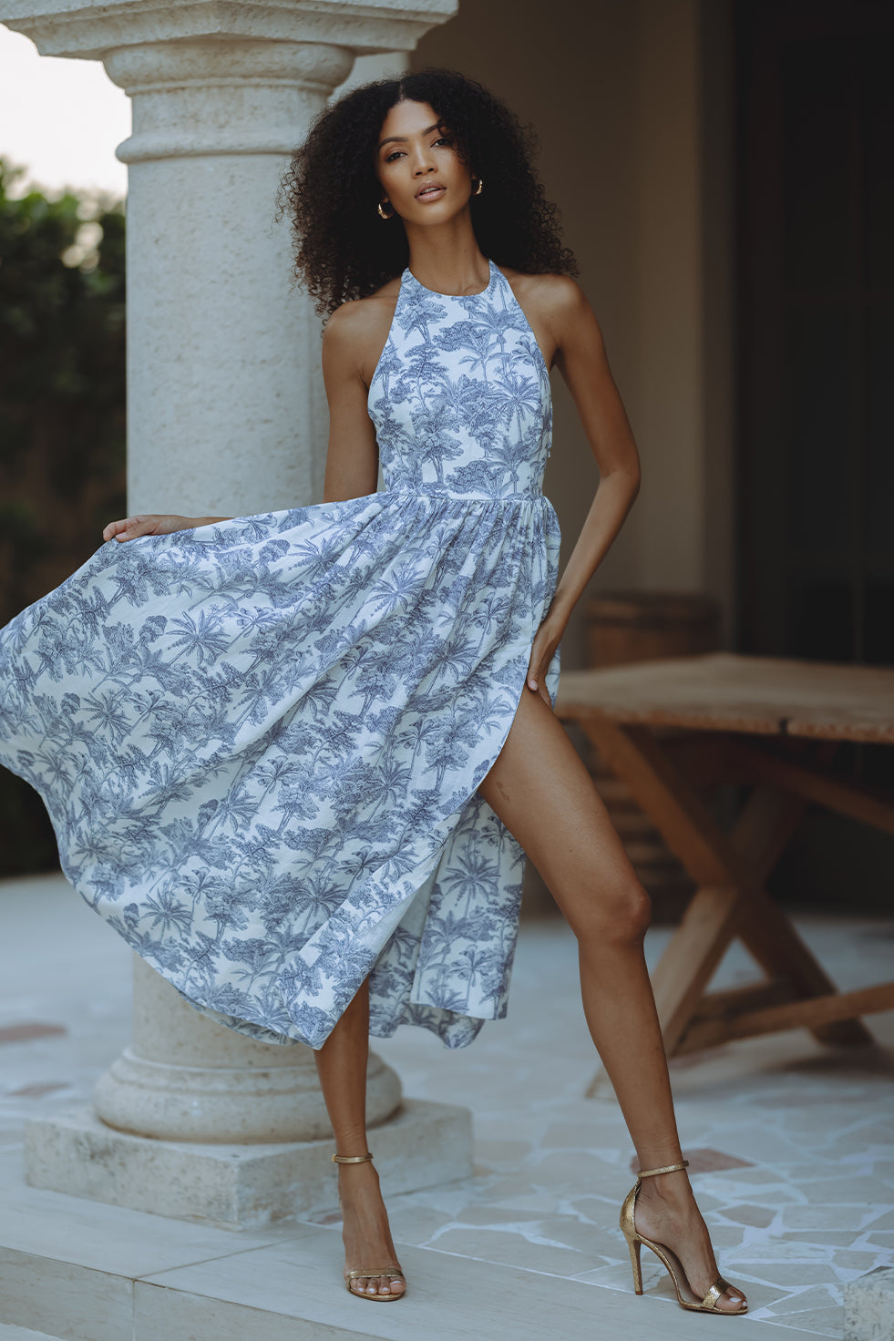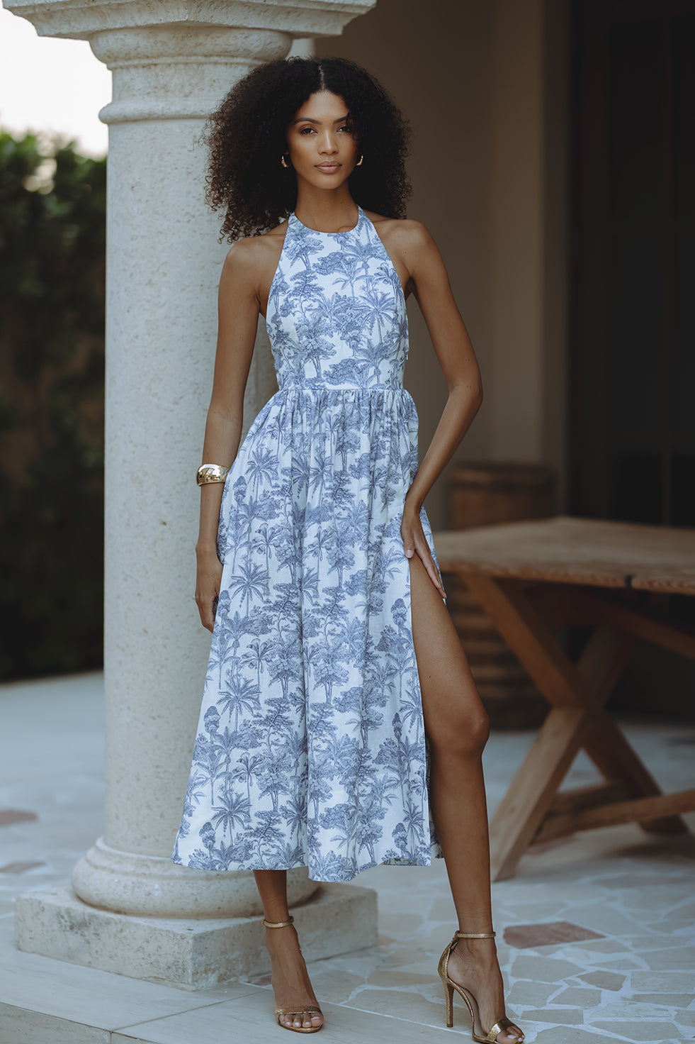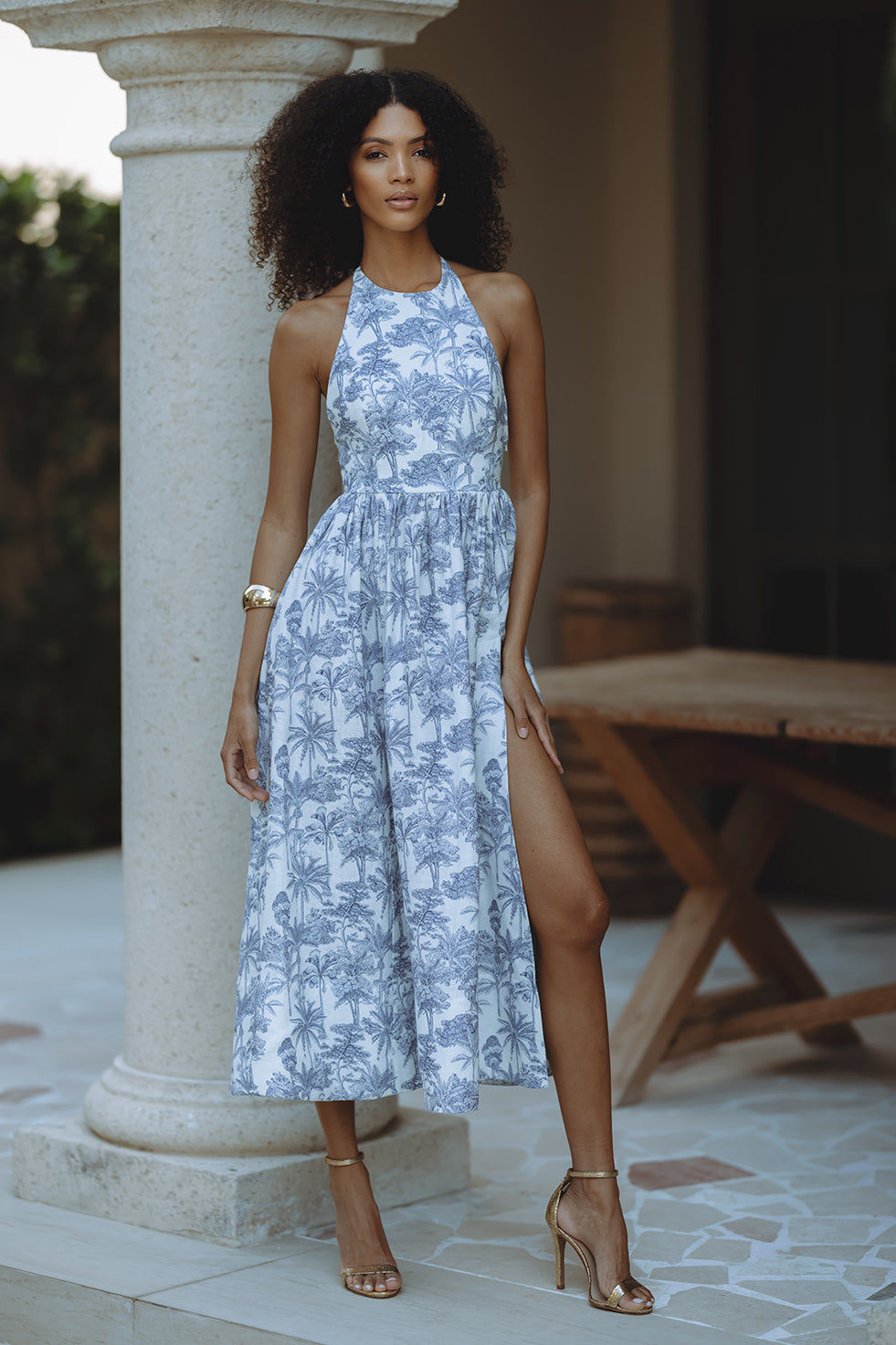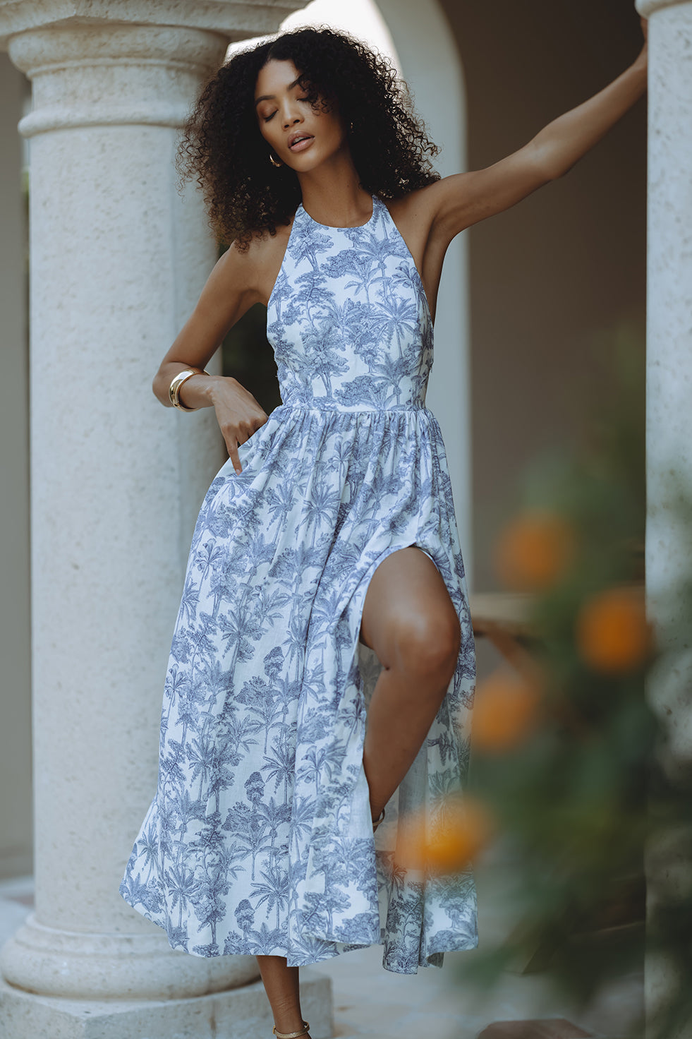 Breeze through sun-soaked days in the Antonia Linen Dress in a refreshing blue palm print. Crafted from airy linen, this halter-neck midi dress features an open back with a delicate strap, a cinched waist for a flattering silhouette, and a daring thigh-high slit for effortless movement. Perfect for tropical getaways or seaside strolls, Antonia blends laid-back elegance with a touch of island allure.