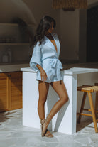 Breeze through warm days in the Maxie Linen Playsuit in Sky Blue, a dreamy blend of relaxed elegance and coastal cool. Cut from airy 100% linen, it features a plunging neckline, billowy sleeves, and a self-tie belt to define the waist. The tailored shorts keep it polished yet playful—perfect for sunlit brunches or barefoot strolls by the sea. A soft, sky-hued staple made for chasing endless summer moments.