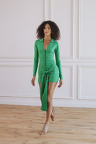 The Alexie Long Sleeve Mini Dress in green is a striking balance of modern elegance and minimal edge. Crafted from a soft viscose blend knit, it contours the body while offering comfortable stretch. Featuring a collared neckline and button-down front, the silhouette is elevated with a self-tie waist detail that can be styled to accentuate your shape. The vibrant green hue adds a bold yet refined touch, perfect for making a statement from day to night.