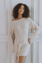 The Himari Knit Mini Dress in sand is the ultimate blend of comfort and effortless sophistication. Crafted from a soft acrylic-cotton blend, it features a relaxed silhouette with an off-shoulder neckline and long sleeves for an understated, feminine appeal. The self-tie detail at the waist allows you to adjust the fit for a more defined shape, while the ribbed knit texture adds subtle dimension. Perfect for transitioning from day to night with minimal effort.