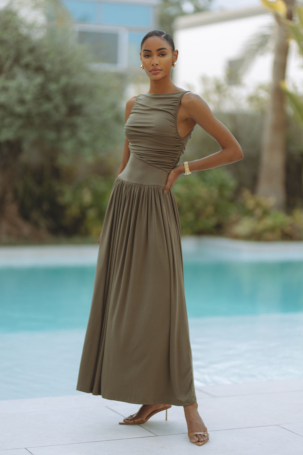 Effortlessly chic, the Nalla Maxi Dress in Olive is crafted from soft jersey fabric for ultimate comfort and flow. Featuring a ruched bodice, sleeveless cut, and a flattering cinched waist, this timeless maxi silhouette drapes beautifully with every step. Perfect for summer evenings, resort getaways, or casual-chic occasions, it pairs seamlessly with sandals or heels for a versatile, elegant look.