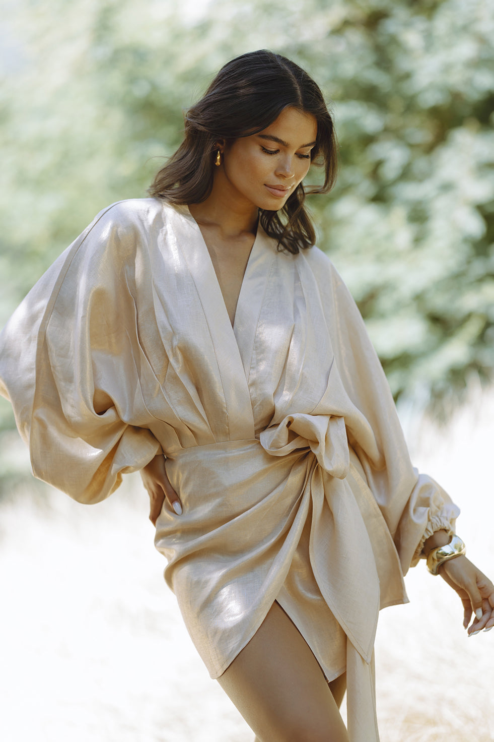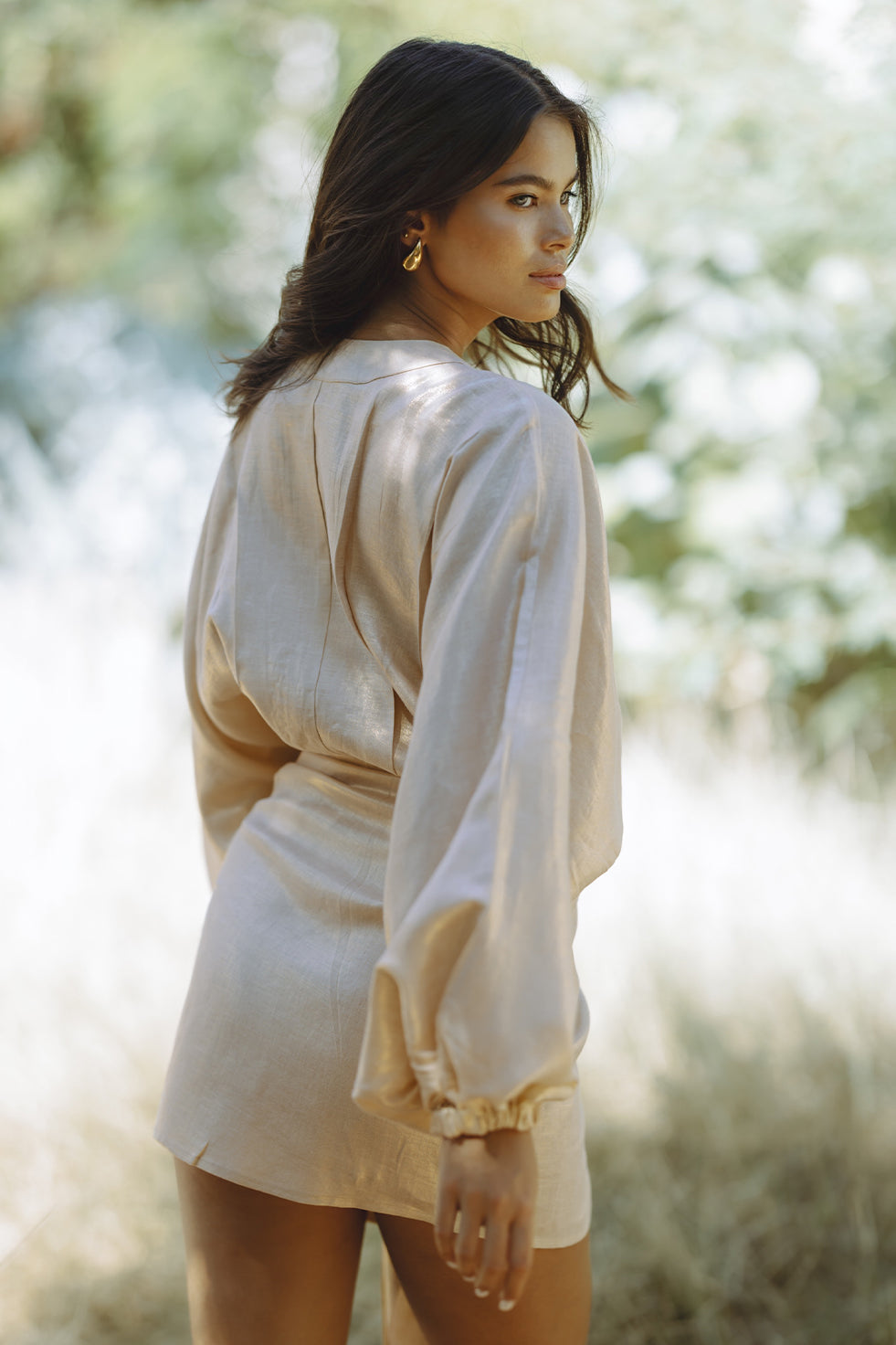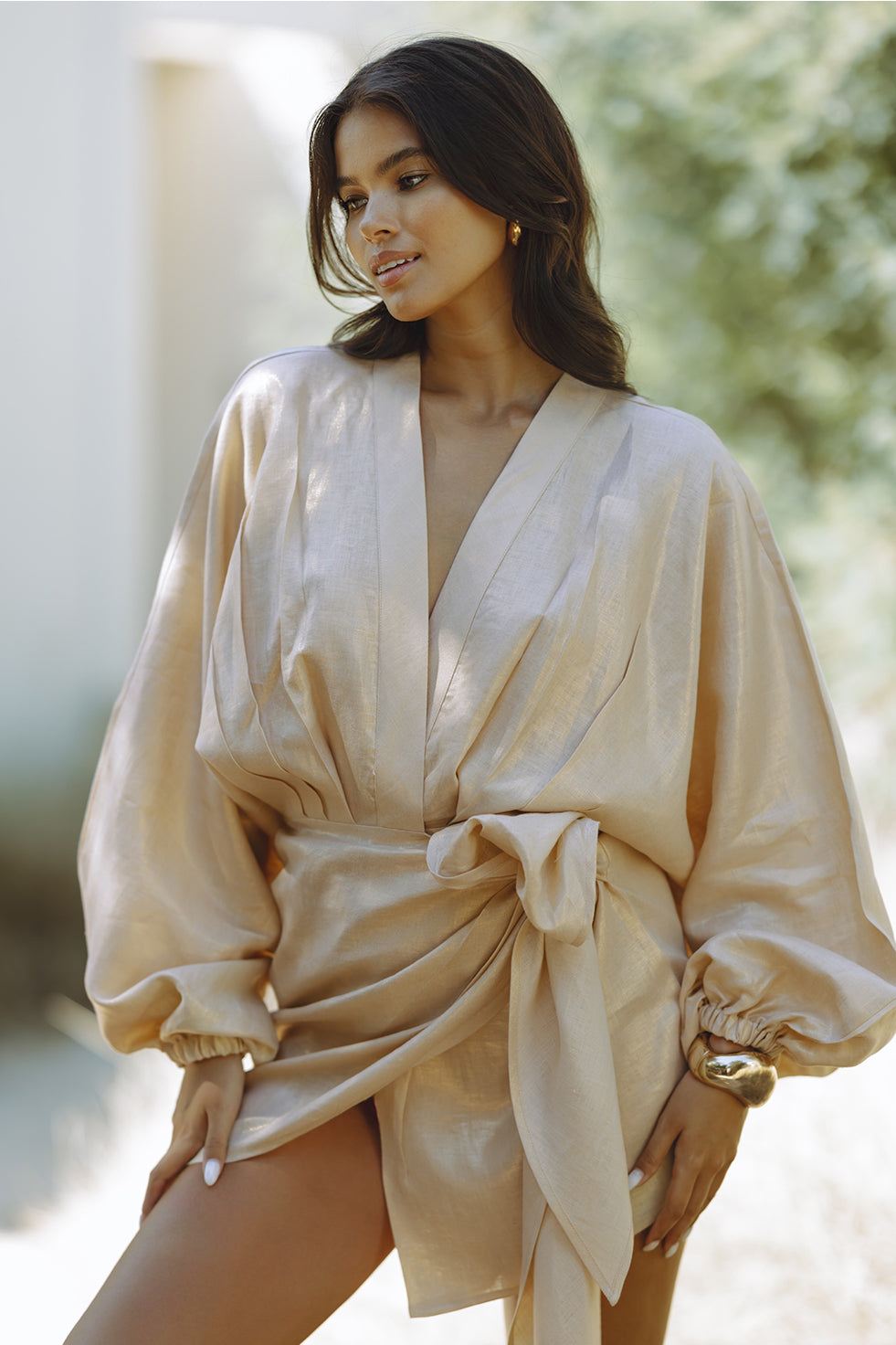 ROMARA LINEN FOIL DRESS - BEIGE GOLD
