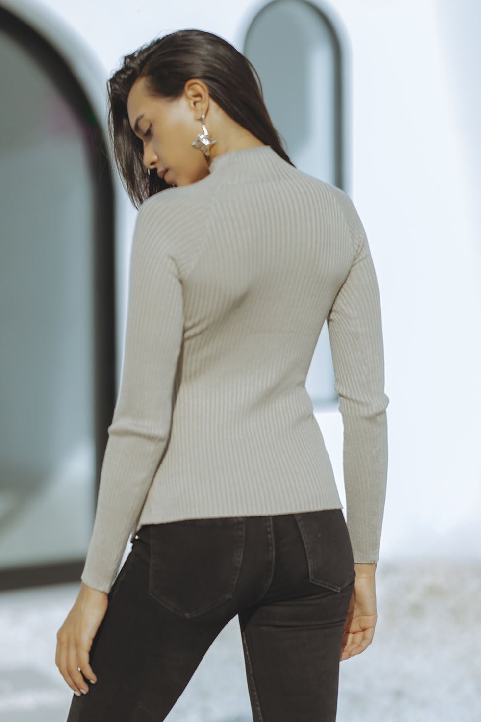 Stay warm and stylish this season with the Sumi knit top. This long-sleeved, khaki mini turtle neck sweater has a cut out bust and belly design and is crafted from a soft blend of cotton and polyester. Easy to dress up or down, pair with black jeans, leggings, or a leather skirt to complete the look. Perfect for chilly fall days.