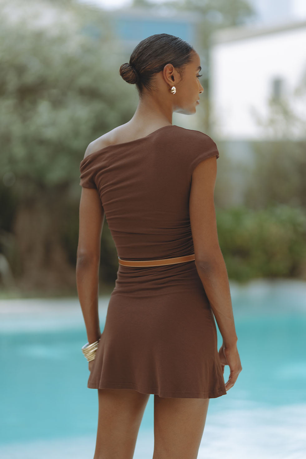 TALLI ASYMMETRICAL NECK MINI DRESS - ESPRESSO