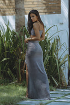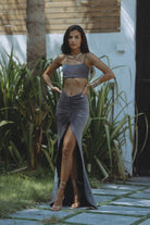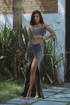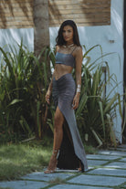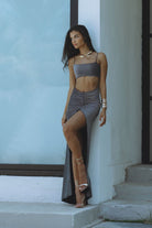 This sleek silver skirt has a flattering V-waistline and features a high-low maxi silhouette. Crafted from luxe lurex, spandex, and nylon, it has a snug fit and provides comfort and flexibility for all-night wear. Two string details to be worn either tied in a bow or loose. The ideal skirt for parties and evenings out when paired with the Jia top.