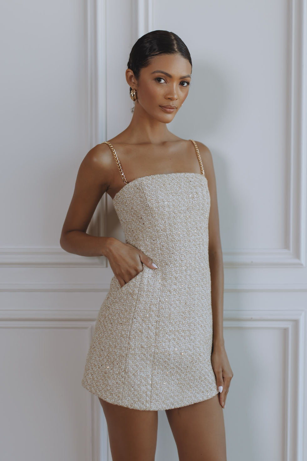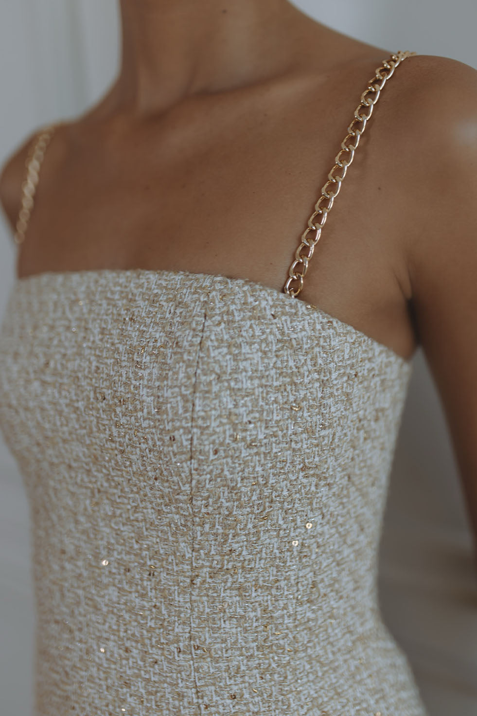 Refined yet striking, the Minola Bouclé Hourglass Mini Dress is designed to sculpt and flatter with effortless elegance. Crafted from textured light-gold bouclé woven with a subtle shimmer, this mini dress features a clean straight neckline and luxe gold-tone chain straps that elevate the silhouette with a modern, jewellery-inspired finish.