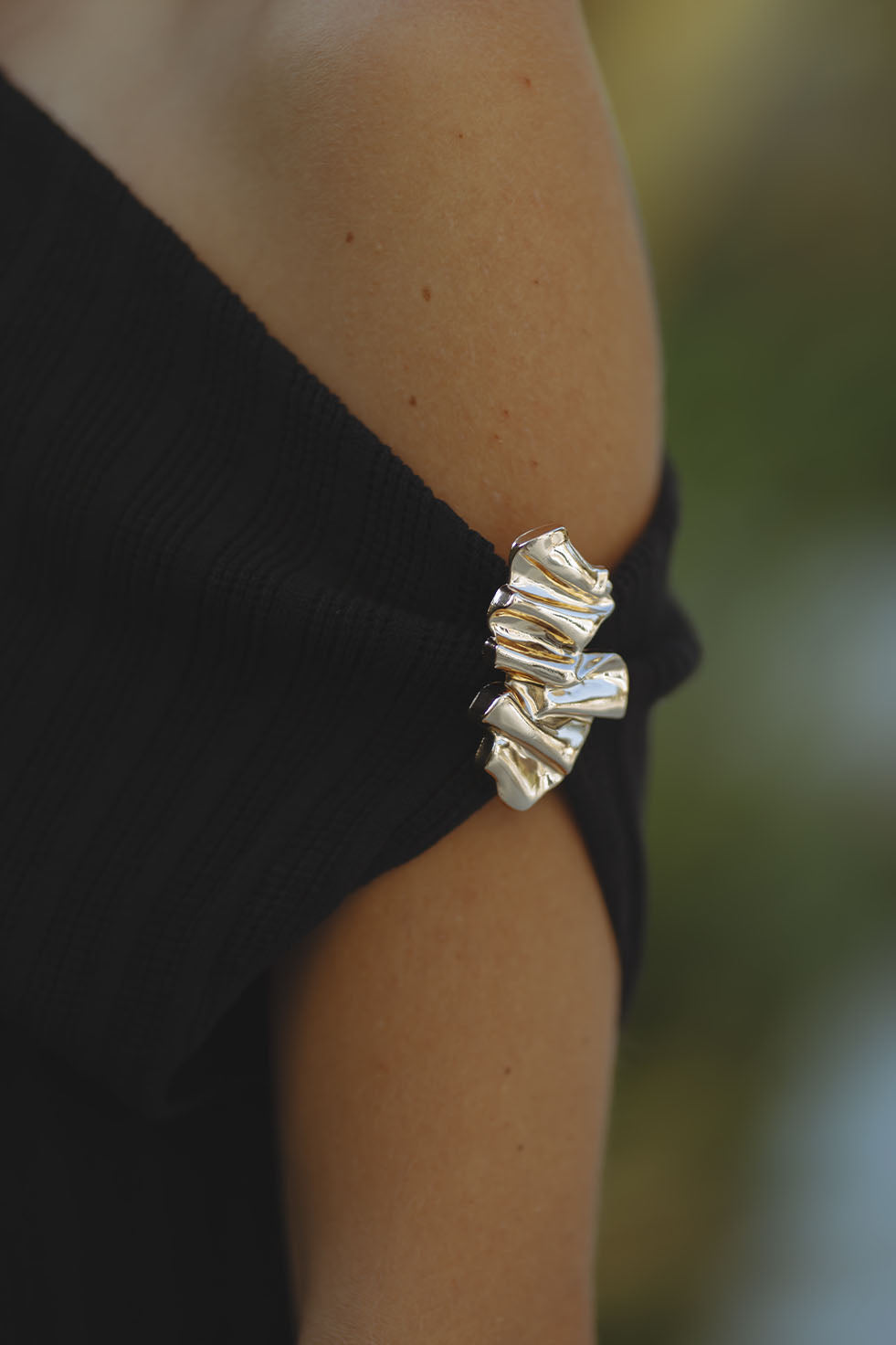 - Sculptural gold trim shoulder detail