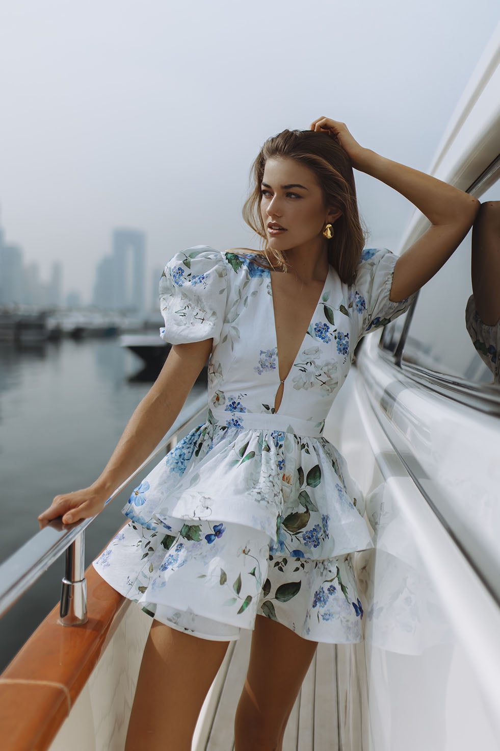 Effortlessly feminine and refined, the Aubrina Linen Mini Dress is crafted in breathable linen and adorned with the soft Jardin Bleu floral print. Designed with a plunging V-neckline and statement puff sleeves, it features a tiered mini skirt that adds light movement and charm.