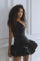 The Gigi Asymmetric Mini Dress is designed to make an effortless statement. Crafted in classic black, this one shoulder silhouette features soft draping across the bodice that contours the waist, flowing into a playful layered ruffle hem for movement and charm.