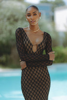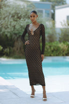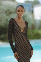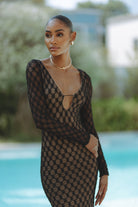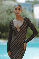 The Yazmin Lace Midi Dress exudes after-dark allure with its intricate geometric lace and curve-skimming silhouette. A plunging scoop neckline meets a delicate keyhole cut-out, creating a striking focal point. Long sleeves balance the bold design, while the midi length adds a touch of refined drama. Designed to make an entrance, Yazmin is your go-to for elevated evenings and unforgettable moments.