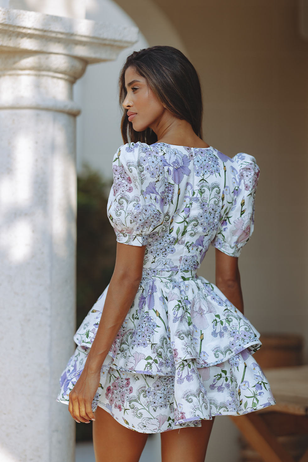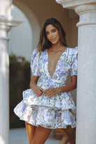 Step into a garden of elegance with the Aubrie Linen Mini Dress, featuring a floral print in soft purples and whites. This enchanting piece is designed with voluminous puff sleeves and a deep V-neckline that lead into a cinched waist and a gracefully flared skirt. Perfect for spring soirees or a stylish day out, this dress combines classic femininity with a touch of modern flair.
