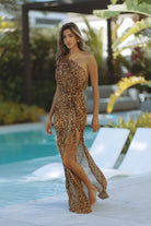 Unleash your wild side in the Costella Silk Maxi Dress. Crafted from ultra-lightweight silk, this one-shoulder silhouette features a fierce leopard print, sultry thigh-high slit, and a flattering waist tie with tassel detail. The breezy drape and sheer finish make it the ultimate luxe resort piece—perfect for poolside glam or sunset cocktails. Confidence meets elegance in every stride.