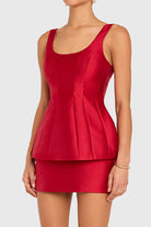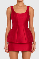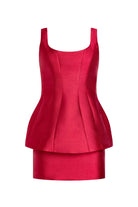 A sculpted moment. The Empire Dress is cut from a structured satin that cinches and shapes the body, creating a defined hourglass silhouette. Featuring a rounded neckline, paneled bodice and a peplum flare that accentuates the waist. Finished in a striking scarlet red for timeless evening elegance.