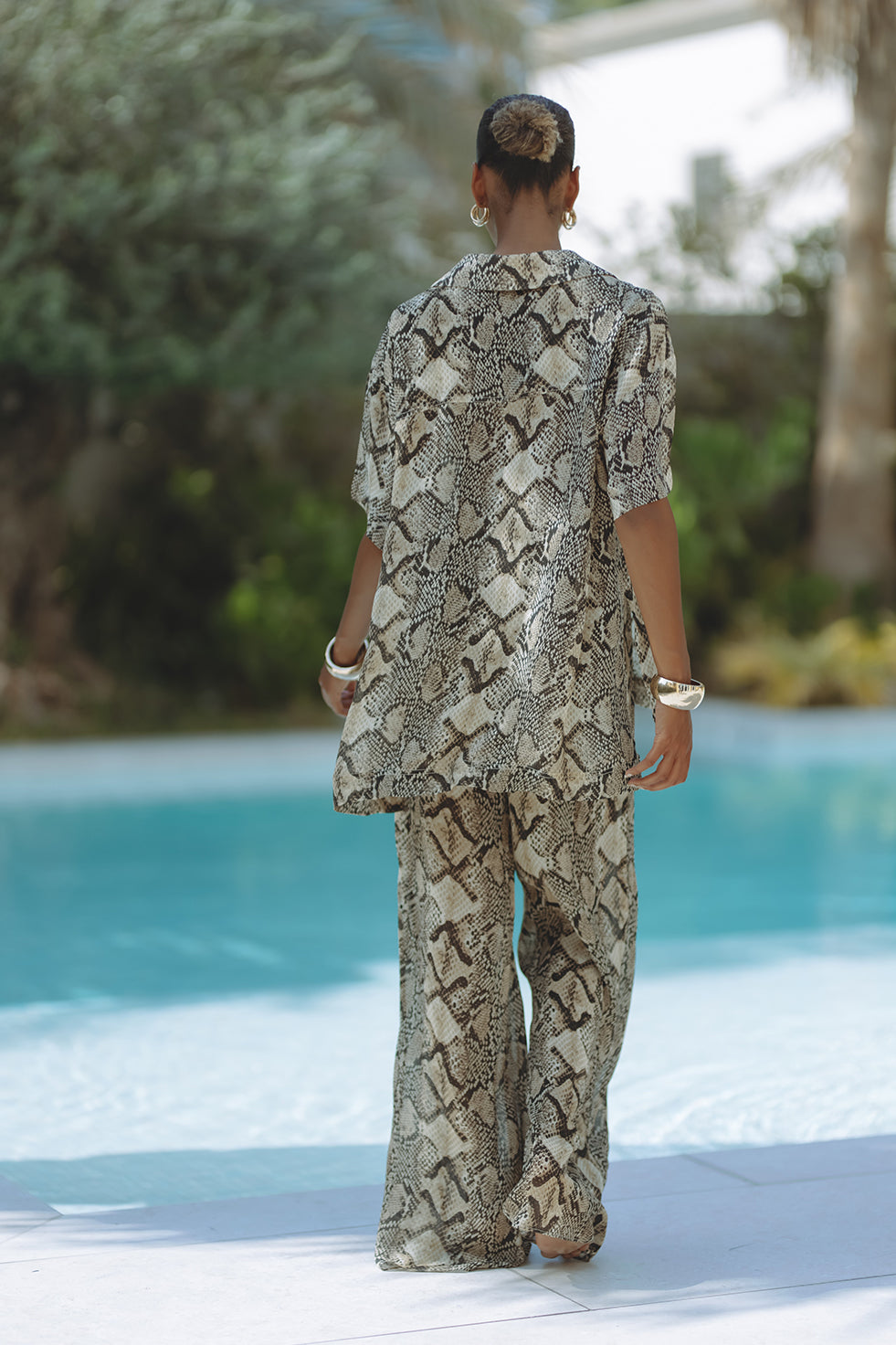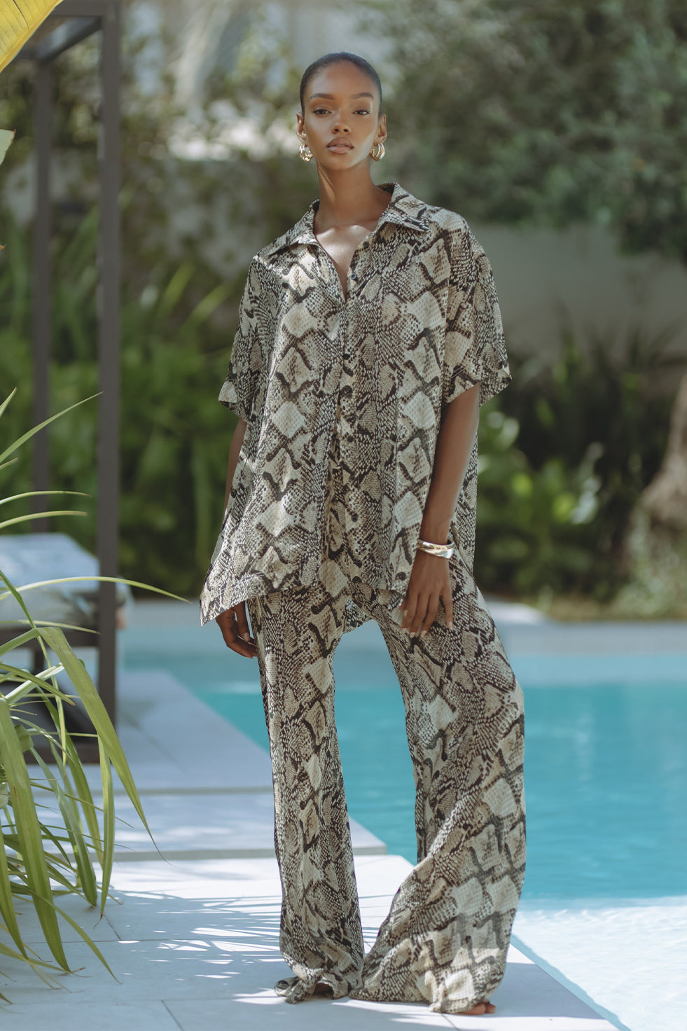 Elevate your off-duty style with the Everlyne Pants, crafted from lightweight viscose in a striking snake print. Designed with a relaxed, wide-leg silhouette and elastic waistband for effortless comfort. Ideal for sun-drenched escapes or stylish city strolls—pair with the matching shirt for a statement set or wear solo for a touch of wild sophistication.