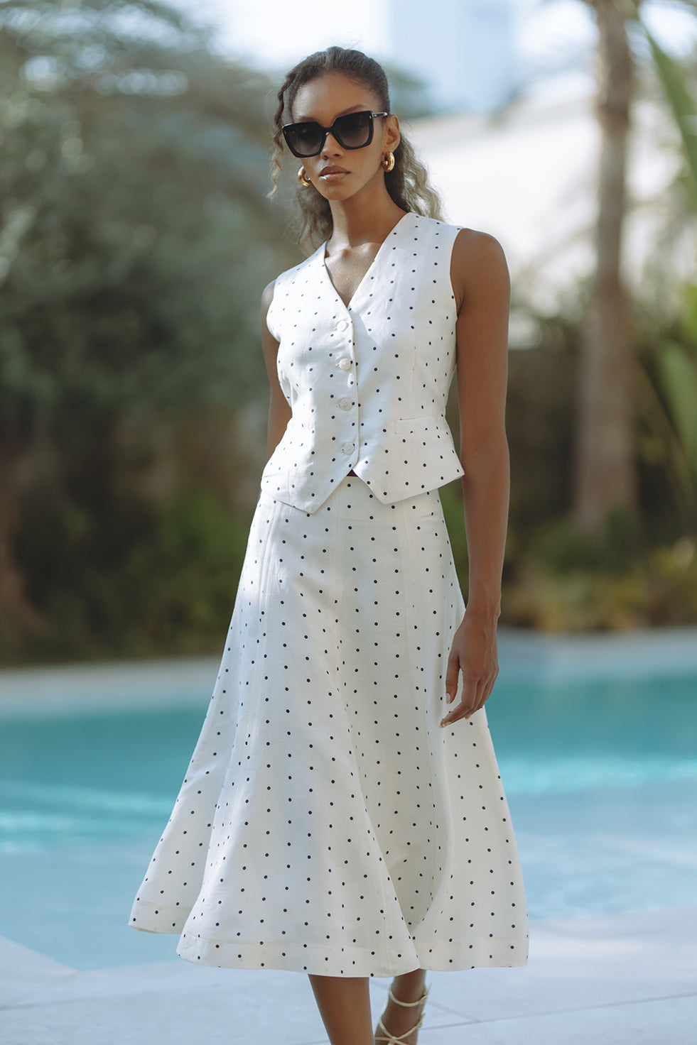 Chic and tailored, the Gabby Vest in soft linen-viscose brings effortless polish to warm-weather days. Featuring a flattering V-neckline, button front, and subtle waist shaping with a back tie detail, it’s playfully patterned in classic black polka dots on crisp white. Pair it with matching shorts for a resort-ready statement that feels both timeless and fresh.