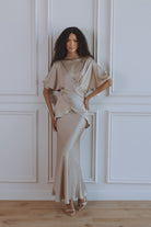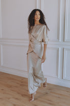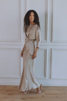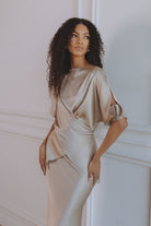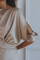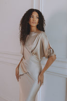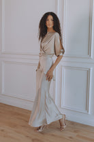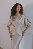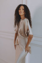 Refined and elegant, the Marcy Satin Blouse in Champagne is cut from lustrous satin that drapes beautifully over the body. The blouse features two front strings that tie at the back, creating a flattering wrap-style silhouette. Designed with elbow-length sleeves, the look is elevated by delicate cut-out detailing and finished with buttoned cuffs for a polished touch. With its bateau neckline and fluid structure, the Marcy Blouse transitions seamlessly from day to night.