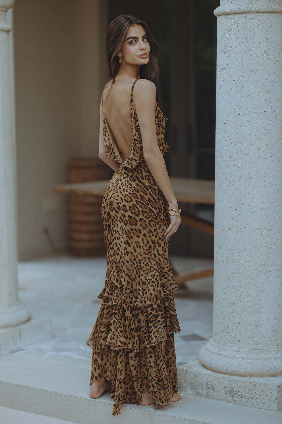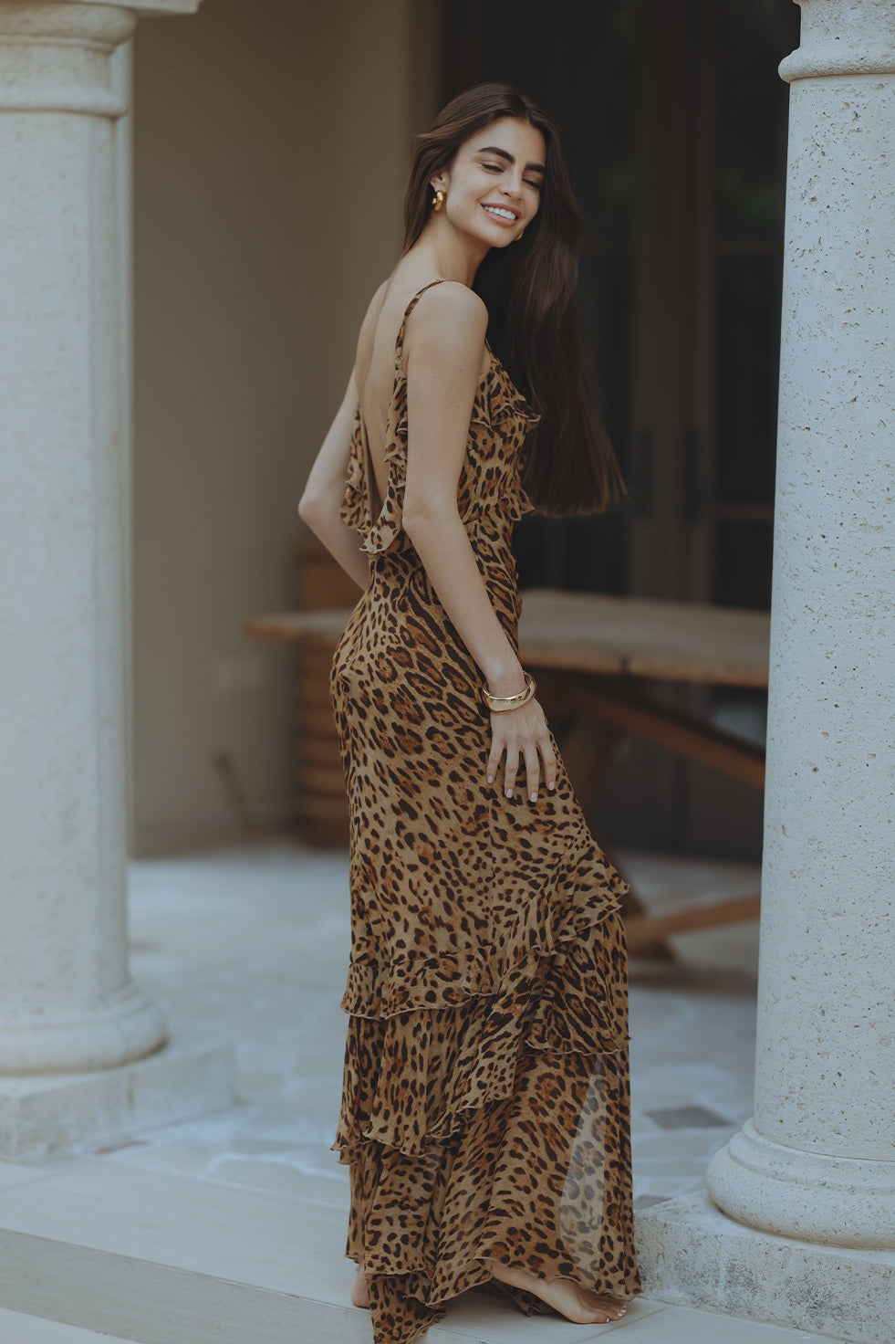 The Saffron Maxi Dress in Leopard is fierce sophistication in flowing silk chiffon. Featuring delicate spaghetti straps and a plunging neckline with soft ruffle detailing, it hugs the body before cascading into a dramatic tiered hem with a thigh-high slit for alluring movement. The low draped back adds a sultry finish, making this statement dress perfect for sunset cocktails, glamorous getaways, or unforgettable nights out.