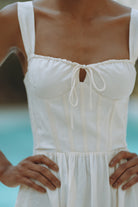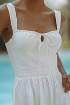 Graceful and refined, the Sancia Corset Midi Dress is cut from luxurious ivory jacquard with a subtle textured sheen. Featuring a structured corset bodice with a delicate tie-front detail, wide straps, and a flattering A-line silhouette, it blends elegance with ease. The smocked back ensures a comfortable fit, while a waist tie enhances feminine shape. Perfect for bridal showers, garden soirées, or romantic evenings, this timeless midi exudes effortless sophistication.