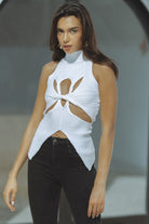 This fall, make a statement with the Sumi knit top in white. Crafted from a blend of 65% cotton and 35% polyester, this sleeveless knit top features a turtle neck and twisted bust cut out detailing. A unique under bust cut out detail shows just the right amount of skin, making it perfect for any evening look. Pair with a black leather skirt and boots to complete the fit.